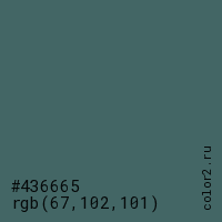 Цвет #436665 в цветовой модели RGB обозначается тремя октетами (67, 102, 101) в десятичном формате и #436665 в шестнадцатиричном (hex) формате, которые являются интенсивностью красного 67 (hex 43), интенсивность зелёного 102 (hex 66) и интенсивность синего 101 (hex 65).
