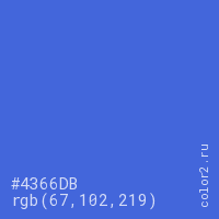 Цвет #4366DB в цветовой модели RGB обозначается тремя октетами (67, 102, 219) в десятичном формате и #4366DB в шестнадцатиричном (hex) формате, которые являются интенсивностью красного 67 (hex 43), интенсивность зелёного 102 (hex 66) и интенсивность синего 219 (hex DB).