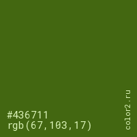 Цвет #436711 в цветовой модели RGB обозначается тремя октетами (67, 103, 17) в десятичном формате и #436711 в шестнадцатиричном (hex) формате, которые являются интенсивностью красного 67 (hex 43), интенсивность зелёного 103 (hex 67) и интенсивность синего 17 (hex 11).