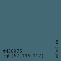Цвет #436975 в цветовой модели RGB обозначается тремя октетами (67, 105, 117) в десятичном формате и #436975 в шестнадцатиричном (hex) формате, которые являются интенсивностью красного 67 (hex 43), интенсивность зелёного 105 (hex 69) и интенсивность синего 117 (hex 75).