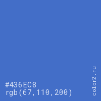 Цвет #436EC8 в цветовой модели RGB обозначается тремя октетами (67, 110, 200) в десятичном формате и #436EC8 в шестнадцатиричном (hex) формате, которые являются интенсивностью красного 67 (hex 43), интенсивность зелёного 110 (hex 6E) и интенсивность синего 200 (hex C8).