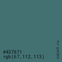 Цвет #437071 в цветовой модели RGB обозначается тремя октетами (67, 112, 113) в десятичном формате и #437071 в шестнадцатиричном (hex) формате, которые являются интенсивностью красного 67 (hex 43), интенсивность зелёного 112 (hex 70) и интенсивность синего 113 (hex 71).
