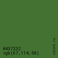 Цвет #437232 в цветовой модели RGB обозначается тремя октетами (67, 114, 50) в десятичном формате и #437232 в шестнадцатиричном (hex) формате, которые являются интенсивностью красного 67 (hex 43), интенсивность зелёного 114 (hex 72) и интенсивность синего 50 (hex 32).