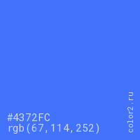 Цвет #4372FC в цветовой модели RGB обозначается тремя октетами (67, 114, 252) в десятичном формате и #4372FC в шестнадцатиричном (hex) формате, которые являются интенсивностью красного 67 (hex 43), интенсивность зелёного 114 (hex 72) и интенсивность синего 252 (hex FC).