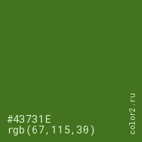 Цвет #43731E в цветовой модели RGB обозначается тремя октетами (67, 115, 30) в десятичном формате и #43731E в шестнадцатиричном (hex) формате, которые являются интенсивностью красного 67 (hex 43), интенсивность зелёного 115 (hex 73) и интенсивность синего 30 (hex 1E).