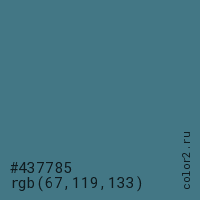 Цвет #437785 в цветовой модели RGB обозначается тремя октетами (67, 119, 133) в десятичном формате и #437785 в шестнадцатиричном (hex) формате, которые являются интенсивностью красного 67 (hex 43), интенсивность зелёного 119 (hex 77) и интенсивность синего 133 (hex 85).