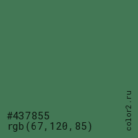 Цвет #437855 в цветовой модели RGB обозначается тремя октетами (67, 120, 85) в десятичном формате и #437855 в шестнадцатиричном (hex) формате, которые являются интенсивностью красного 67 (hex 43), интенсивность зелёного 120 (hex 78) и интенсивность синего 85 (hex 55).