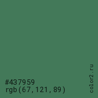 Цвет #437959 в цветовой модели RGB обозначается тремя октетами (67, 121, 89) в десятичном формате и #437959 в шестнадцатиричном (hex) формате, которые являются интенсивностью красного 67 (hex 43), интенсивность зелёного 121 (hex 79) и интенсивность синего 89 (hex 59).