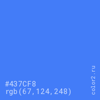 Цвет #437CF8 в цветовой модели RGB обозначается тремя октетами (67, 124, 248) в десятичном формате и #437CF8 в шестнадцатиричном (hex) формате, которые являются интенсивностью красного 67 (hex 43), интенсивность зелёного 124 (hex 7C) и интенсивность синего 248 (hex F8).