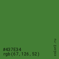 Цвет #437E34 в цветовой модели RGB обозначается тремя октетами (67, 126, 52) в десятичном формате и #437E34 в шестнадцатиричном (hex) формате, которые являются интенсивностью красного 67 (hex 43), интенсивность зелёного 126 (hex 7E) и интенсивность синего 52 (hex 34).