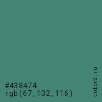 Цвет #438474 в цветовой модели RGB обозначается тремя октетами (67, 132, 116) в десятичном формате и #438474 в шестнадцатиричном (hex) формате, которые являются интенсивностью красного 67 (hex 43), интенсивность зелёного 132 (hex 84) и интенсивность синего 116 (hex 74).