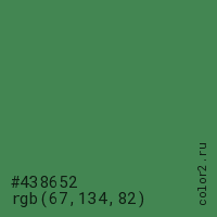 Цвет #438652 в цветовой модели RGB обозначается тремя октетами (67, 134, 82) в десятичном формате и #438652 в шестнадцатиричном (hex) формате, которые являются интенсивностью красного 67 (hex 43), интенсивность зелёного 134 (hex 86) и интенсивность синего 82 (hex 52).