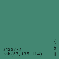 Цвет #438772 в цветовой модели RGB обозначается тремя октетами (67, 135, 114) в десятичном формате и #438772 в шестнадцатиричном (hex) формате, которые являются интенсивностью красного 67 (hex 43), интенсивность зелёного 135 (hex 87) и интенсивность синего 114 (hex 72).