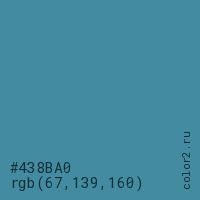 Цвет #438BA0 в цветовой модели RGB обозначается тремя октетами (67, 139, 160) в десятичном формате и #438BA0 в шестнадцатиричном (hex) формате, которые являются интенсивностью красного 67 (hex 43), интенсивность зелёного 139 (hex 8B) и интенсивность синего 160 (hex A0).