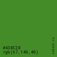 Цвет #438C28 в цветовой модели RGB обозначается тремя октетами (67, 140, 40) в десятичном формате и #438C28 в шестнадцатиричном (hex) формате, которые являются интенсивностью красного 67 (hex 43), интенсивность зелёного 140 (hex 8C) и интенсивность синего 40 (hex 28).