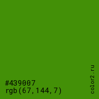 Цвет #439007 в цветовой модели RGB обозначается тремя октетами (67, 144, 7) в десятичном формате и #439007 в шестнадцатиричном (hex) формате, которые являются интенсивностью красного 67 (hex 43), интенсивность зелёного 144 (hex 90) и интенсивность синего 7 (hex 07).