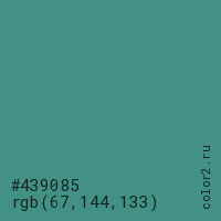 Цвет #439085 в цветовой модели RGB обозначается тремя октетами (67, 144, 133) в десятичном формате и #439085 в шестнадцатиричном (hex) формате, которые являются интенсивностью красного 67 (hex 43), интенсивность зелёного 144 (hex 90) и интенсивность синего 133 (hex 85).