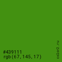 Цвет #439111 в цветовой модели RGB обозначается тремя октетами (67, 145, 17) в десятичном формате и #439111 в шестнадцатиричном (hex) формате, которые являются интенсивностью красного 67 (hex 43), интенсивность зелёного 145 (hex 91) и интенсивность синего 17 (hex 11).