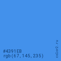 Цвет #4391EB в цветовой модели RGB обозначается тремя октетами (67, 145, 235) в десятичном формате и #4391EB в шестнадцатиричном (hex) формате, которые являются интенсивностью красного 67 (hex 43), интенсивность зелёного 145 (hex 91) и интенсивность синего 235 (hex EB).