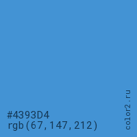 Цвет #4393D4 в цветовой модели RGB обозначается тремя октетами (67, 147, 212) в десятичном формате и #4393D4 в шестнадцатиричном (hex) формате, которые являются интенсивностью красного 67 (hex 43), интенсивность зелёного 147 (hex 93) и интенсивность синего 212 (hex D4).