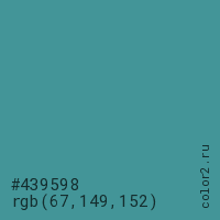 Цвет #439598 в цветовой модели RGB обозначается тремя октетами (67, 149, 152) в десятичном формате и #439598 в шестнадцатиричном (hex) формате, которые являются интенсивностью красного 67 (hex 43), интенсивность зелёного 149 (hex 95) и интенсивность синего 152 (hex 98).