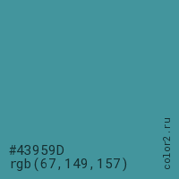 Цвет #43959D в цветовой модели RGB обозначается тремя октетами (67, 149, 157) в десятичном формате и #43959D в шестнадцатиричном (hex) формате, которые являются интенсивностью красного 67 (hex 43), интенсивность зелёного 149 (hex 95) и интенсивность синего 157 (hex 9D).