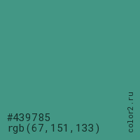 Цвет #439785 в цветовой модели RGB обозначается тремя октетами (67, 151, 133) в десятичном формате и #439785 в шестнадцатиричном (hex) формате, которые являются интенсивностью красного 67 (hex 43), интенсивность зелёного 151 (hex 97) и интенсивность синего 133 (hex 85).