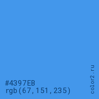 Цвет #4397EB в цветовой модели RGB обозначается тремя октетами (67, 151, 235) в десятичном формате и #4397EB в шестнадцатиричном (hex) формате, которые являются интенсивностью красного 67 (hex 43), интенсивность зелёного 151 (hex 97) и интенсивность синего 235 (hex EB).