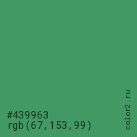 Цвет #439963 в цветовой модели RGB обозначается тремя октетами (67, 153, 99) в десятичном формате и #439963 в шестнадцатиричном (hex) формате, которые являются интенсивностью красного 67 (hex 43), интенсивность зелёного 153 (hex 99) и интенсивность синего 99 (hex 63).