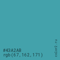 Цвет #43A2AB в цветовой модели RGB обозначается тремя октетами (67, 162, 171) в десятичном формате и #43A2AB в шестнадцатиричном (hex) формате, которые являются интенсивностью красного 67 (hex 43), интенсивность зелёного 162 (hex A2) и интенсивность синего 171 (hex AB).