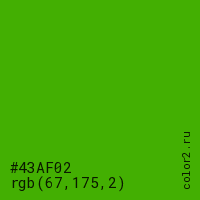 Цвет #43AF02 в цветовой модели RGB обозначается тремя октетами (67, 175, 2) в десятичном формате и #43AF02 в шестнадцатиричном (hex) формате, которые являются интенсивностью красного 67 (hex 43), интенсивность зелёного 175 (hex AF) и интенсивность синего 2 (hex 02).