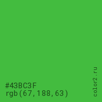 Цвет #43BC3F в цветовой модели RGB обозначается тремя октетами (67, 188, 63) в десятичном формате и #43BC3F в шестнадцатиричном (hex) формате, которые являются интенсивностью красного 67 (hex 43), интенсивность зелёного 188 (hex BC) и интенсивность синего 63 (hex 3F).