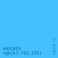 Цвет #43C0FD в цветовой модели RGB обозначается тремя октетами (67, 192, 253) в десятичном формате и #43C0FD в шестнадцатиричном (hex) формате, которые являются интенсивностью красного 67 (hex 43), интенсивность зелёного 192 (hex C0) и интенсивность синего 253 (hex FD).
