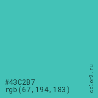 Цвет #43C2B7 в цветовой модели RGB обозначается тремя октетами (67, 194, 183) в десятичном формате и #43C2B7 в шестнадцатиричном (hex) формате, которые являются интенсивностью красного 67 (hex 43), интенсивность зелёного 194 (hex C2) и интенсивность синего 183 (hex B7).