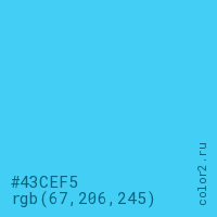 Цвет #43CEF5 в цветовой модели RGB обозначается тремя октетами (67, 206, 245) в десятичном формате и #43CEF5 в шестнадцатиричном (hex) формате, которые являются интенсивностью красного 67 (hex 43), интенсивность зелёного 206 (hex CE) и интенсивность синего 245 (hex F5).
