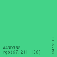 Цвет #43D388 в цветовой модели RGB обозначается тремя октетами (67, 211, 136) в десятичном формате и #43D388 в шестнадцатиричном (hex) формате, которые являются интенсивностью красного 67 (hex 43), интенсивность зелёного 211 (hex D3) и интенсивность синего 136 (hex 88).