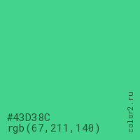 Цвет #43D38C в цветовой модели RGB обозначается тремя октетами (67, 211, 140) в десятичном формате и #43D38C в шестнадцатиричном (hex) формате, которые являются интенсивностью красного 67 (hex 43), интенсивность зелёного 211 (hex D3) и интенсивность синего 140 (hex 8C).