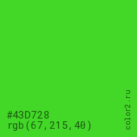 Цвет #43D728 в цветовой модели RGB обозначается тремя октетами (67, 215, 40) в десятичном формате и #43D728 в шестнадцатиричном (hex) формате, которые являются интенсивностью красного 67 (hex 43), интенсивность зелёного 215 (hex D7) и интенсивность синего 40 (hex 28).