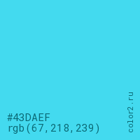Цвет #43DAEF в цветовой модели RGB обозначается тремя октетами (67, 218, 239) в десятичном формате и #43DAEF в шестнадцатиричном (hex) формате, которые являются интенсивностью красного 67 (hex 43), интенсивность зелёного 218 (hex DA) и интенсивность синего 239 (hex EF).