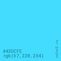 Цвет #43DCFE в цветовой модели RGB обозначается тремя октетами (67, 220, 254) в десятичном формате и #43DCFE в шестнадцатиричном (hex) формате, которые являются интенсивностью красного 67 (hex 43), интенсивность зелёного 220 (hex DC) и интенсивность синего 254 (hex FE).