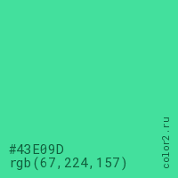 Цвет #43E09D в цветовой модели RGB обозначается тремя октетами (67, 224, 157) в десятичном формате и #43E09D в шестнадцатиричном (hex) формате, которые являются интенсивностью красного 67 (hex 43), интенсивность зелёного 224 (hex E0) и интенсивность синего 157 (hex 9D).