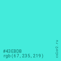 Цвет #43EBDB в цветовой модели RGB обозначается тремя октетами (67, 235, 219) в десятичном формате и #43EBDB в шестнадцатиричном (hex) формате, которые являются интенсивностью красного 67 (hex 43), интенсивность зелёного 235 (hex EB) и интенсивность синего 219 (hex DB).
