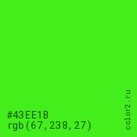 Цвет #43EE1B в цветовой модели RGB обозначается тремя октетами (67, 238, 27) в десятичном формате и #43EE1B в шестнадцатиричном (hex) формате, которые являются интенсивностью красного 67 (hex 43), интенсивность зелёного 238 (hex EE) и интенсивность синего 27 (hex 1B).