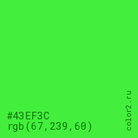 Цвет #43EF3C в цветовой модели RGB обозначается тремя октетами (67, 239, 60) в десятичном формате и #43EF3C в шестнадцатиричном (hex) формате, которые являются интенсивностью красного 67 (hex 43), интенсивность зелёного 239 (hex EF) и интенсивность синего 60 (hex 3C).