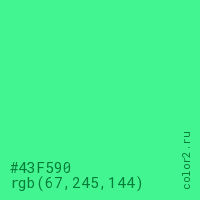 Цвет #43F590 в цветовой модели RGB обозначается тремя октетами (67, 245, 144) в десятичном формате и #43F590 в шестнадцатиричном (hex) формате, которые являются интенсивностью красного 67 (hex 43), интенсивность зелёного 245 (hex F5) и интенсивность синего 144 (hex 90).