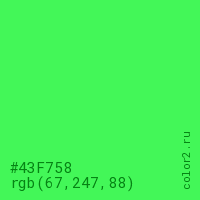 Цвет #43F758 в цветовой модели RGB обозначается тремя октетами (67, 247, 88) в десятичном формате и #43F758 в шестнадцатиричном (hex) формате, которые являются интенсивностью красного 67 (hex 43), интенсивность зелёного 247 (hex F7) и интенсивность синего 88 (hex 58).