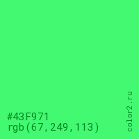 Цвет #43F971 в цветовой модели RGB обозначается тремя октетами (67, 249, 113) в десятичном формате и #43F971 в шестнадцатиричном (hex) формате, которые являются интенсивностью красного 67 (hex 43), интенсивность зелёного 249 (hex F9) и интенсивность синего 113 (hex 71).
