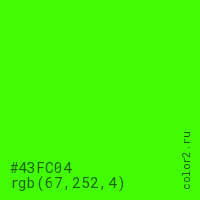 Цвет #43FC04 в цветовой модели RGB обозначается тремя октетами (67, 252, 4) в десятичном формате и #43FC04 в шестнадцатиричном (hex) формате, которые являются интенсивностью красного 67 (hex 43), интенсивность зелёного 252 (hex FC) и интенсивность синего 4 (hex 04).