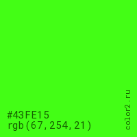 Цвет #43FE15 в цветовой модели RGB обозначается тремя октетами (67, 254, 21) в десятичном формате и #43FE15 в шестнадцатиричном (hex) формате, которые являются интенсивностью красного 67 (hex 43), интенсивность зелёного 254 (hex FE) и интенсивность синего 21 (hex 15).