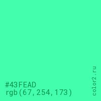 Цвет #43FEAD в цветовой модели RGB обозначается тремя октетами (67, 254, 173) в десятичном формате и #43FEAD в шестнадцатиричном (hex) формате, которые являются интенсивностью красного 67 (hex 43), интенсивность зелёного 254 (hex FE) и интенсивность синего 173 (hex AD).